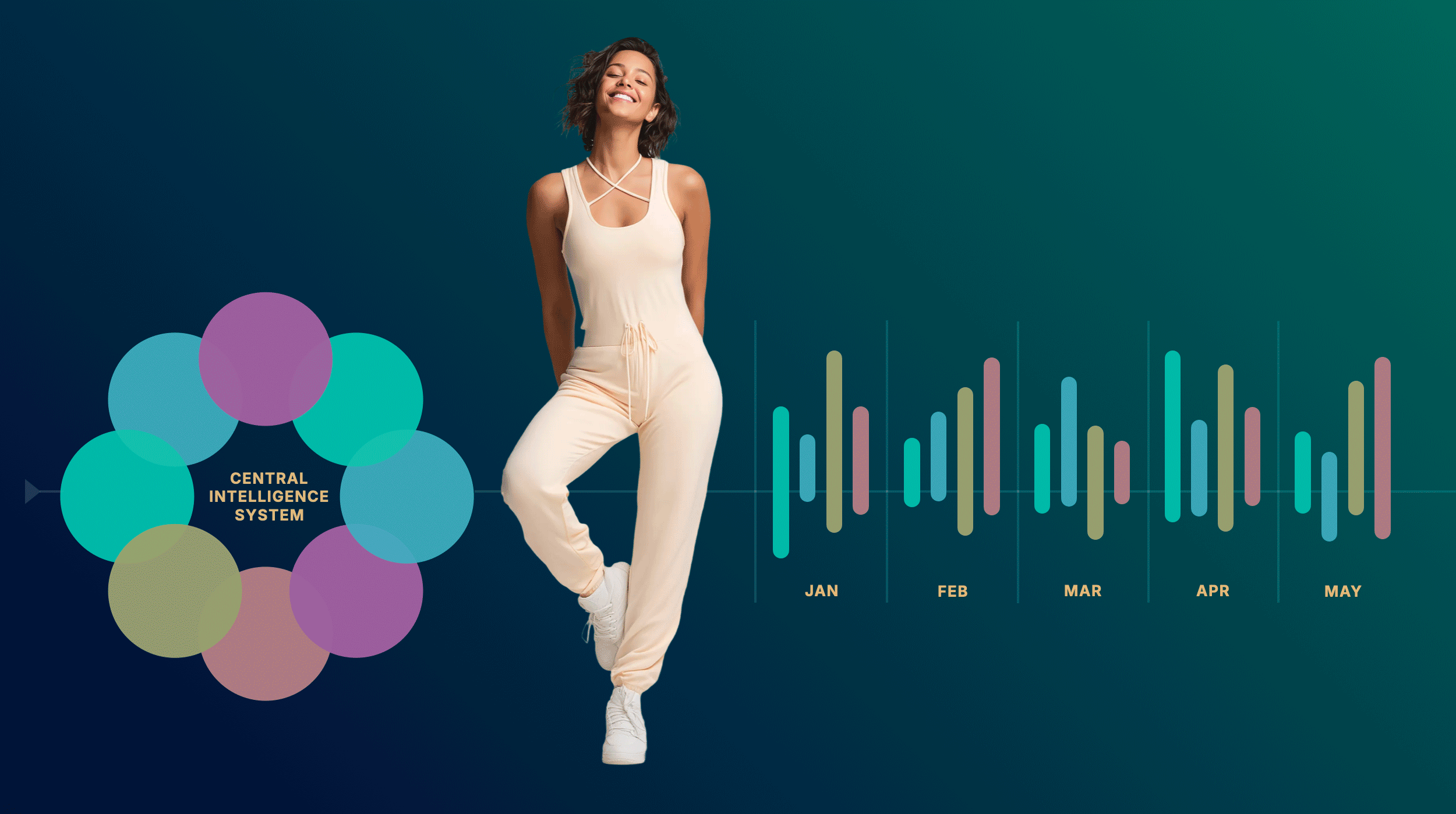 The platform uses a Central Intelligence System to generate continuously evolving, real-time user profiles by integrating wearable streams and clinical data.